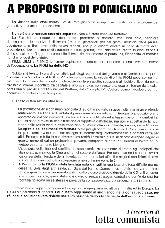 Ma qui più che le parole vale la lettura diretta del volantino con cui LoCom, piuttosto che le questioni di Pomigliano, difende la FIOM autocandidandosi alla guida del sindacato (possibilmente alla socialdemocratica, alla tedesca!) perché CGIL-CISL-UIL non hanno capito la posta in gioco, non hanno strategia, LoCom invece sì, ma comprendiamo tutti che serve a poco(!!!!), essendo decisiva l'abolizione dello sfruttamento dell'uomo sull'uomo.